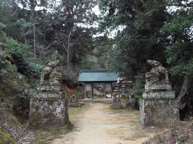 | 尾根の参道に出会う。 | 参道の先に鳥居が見える。 | |