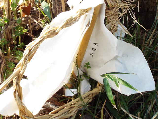 | 竹藪の中の木に御幣が立てられている。 | ||